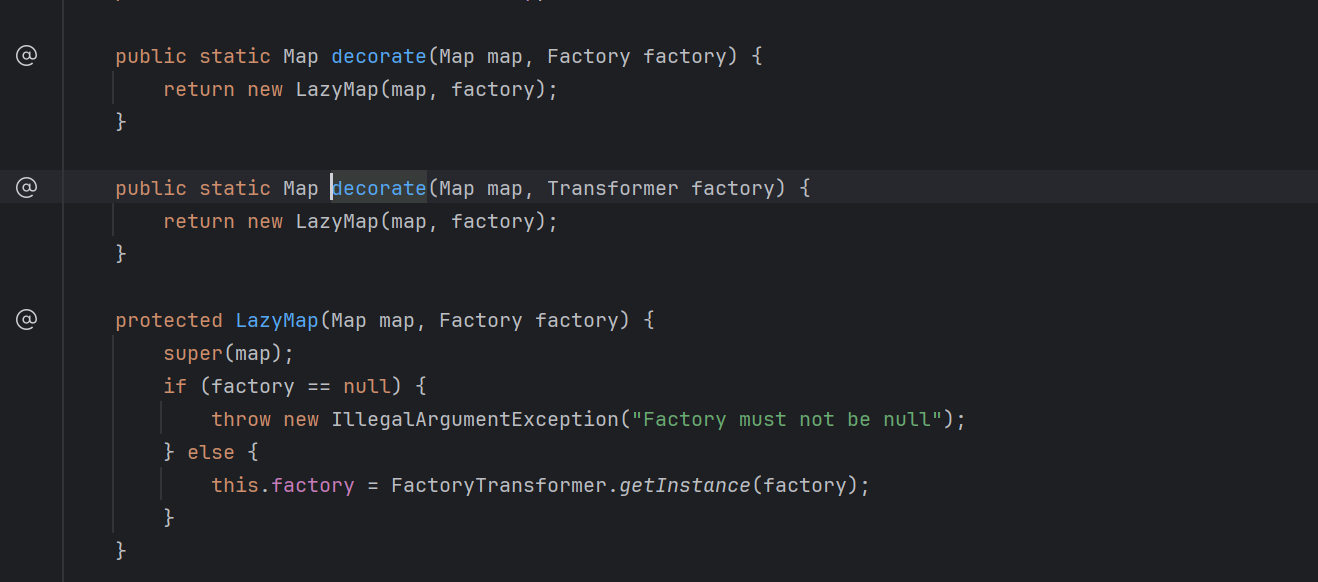 不难看到LazyMap 作为一个装饰器类,自然提供了 decorate 方法,当我们对一个 map 进行装饰的时候,传入的 Transformer factory 设置为 ChainedTransformer 即可将 LazyMap.factory 转为 ChainedTransformer