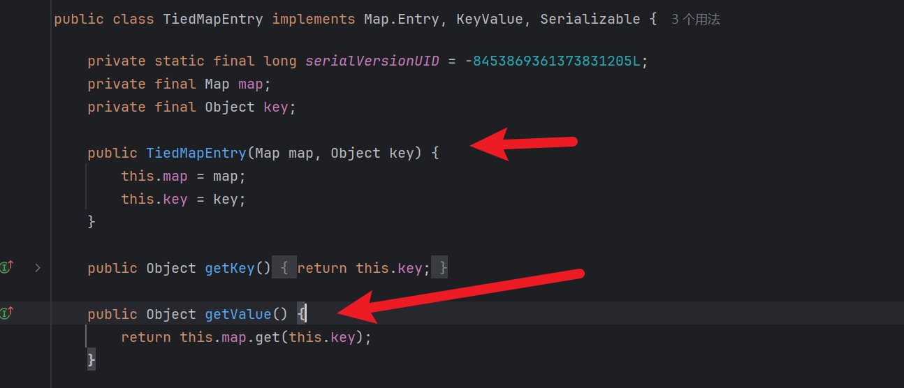 TiedMapEntry 的构造方法期望一个 map 和一个 key ,而当我们调用 TiedMapEntry.getValue 会调用 this.map.get(this.key)