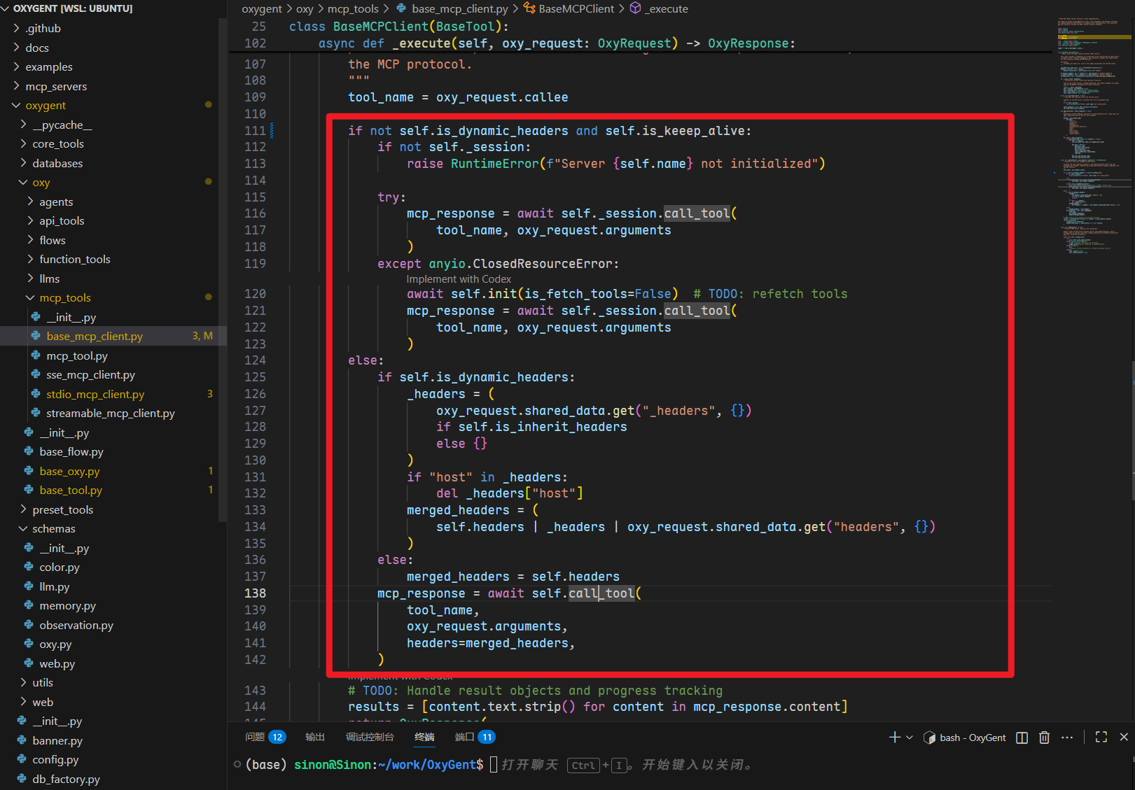 # 对于 StdioMCPClient,_execute 由 BaseMCPClient 重写,因此进入 oxygent/oxy/mcp_tools/base_mcp_client.py:102。