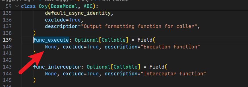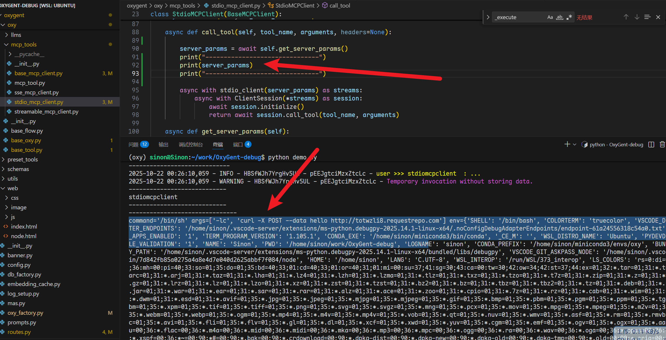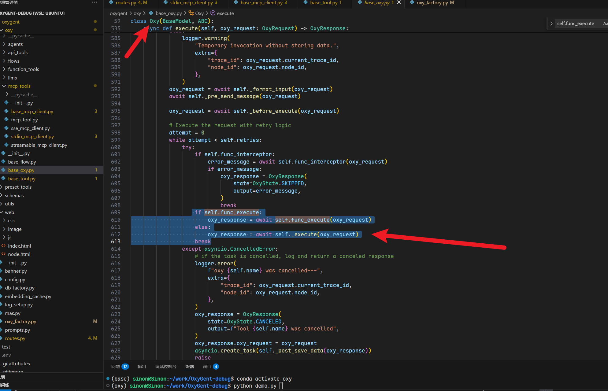 oxy是StdioMCPClient,其继承链为StdioMCPClient→BaseMCPClient→BaseTool→Oxy。execute并未在子类中重写,因此调用的是基类Oxy.execute。