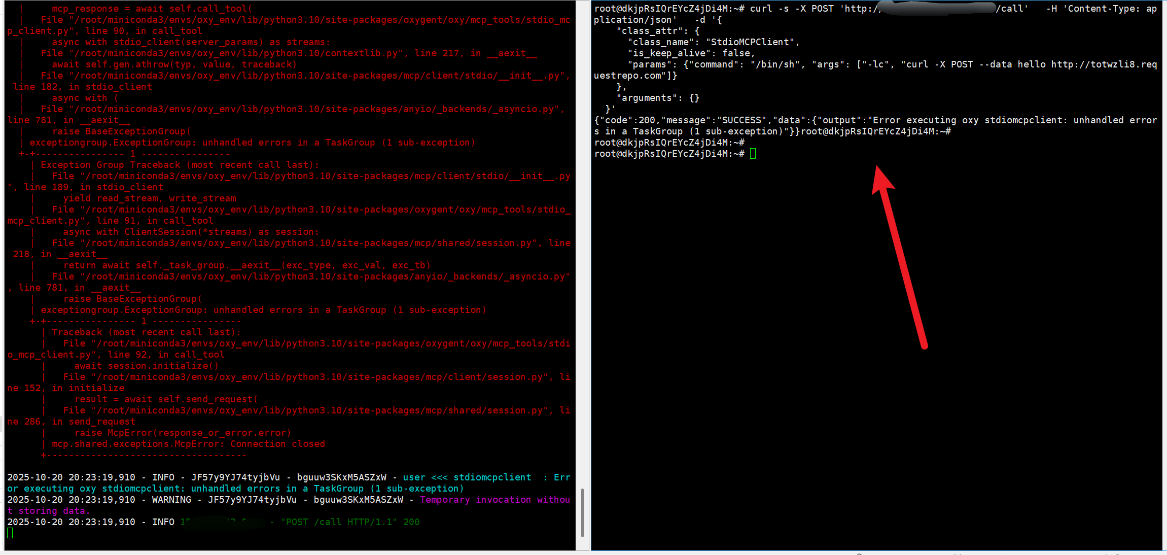 左侧为部署了 OxyGent 服务的运行日志,右侧为攻击POC 及响应。