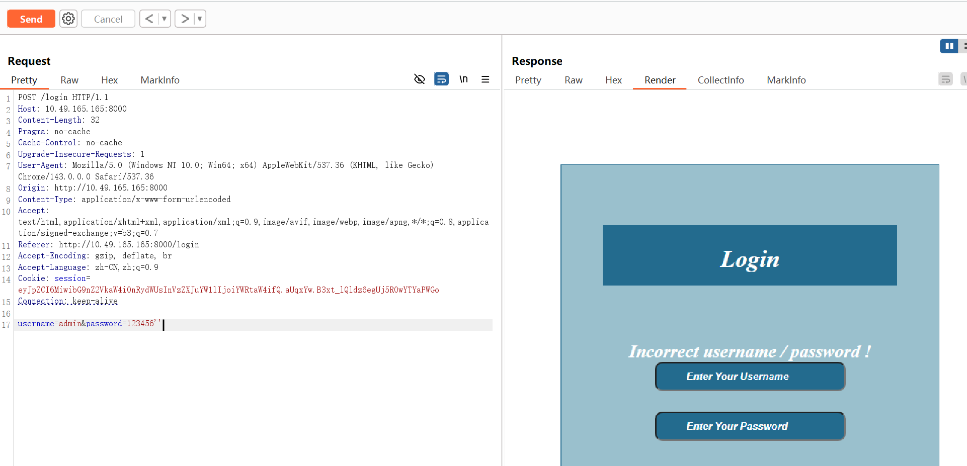抓一下原登录成功的登陆包,可以经典的 单个单引号报错,一对双引号正常。那大概率就是有 SQL 注入了。