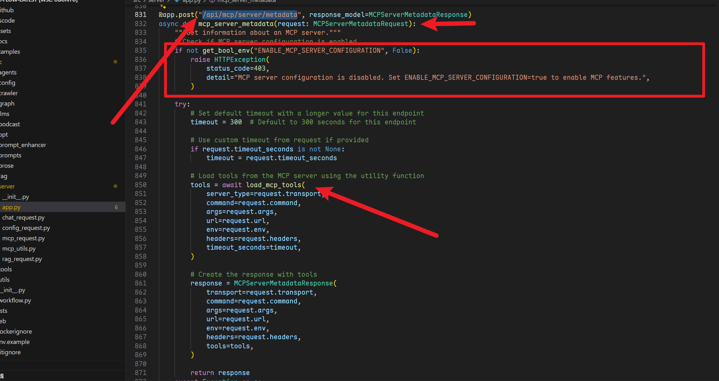 并且我们关注到,传入 load_mcp_tools 函数的参数,均为从 request: MCPServerMetadataRequest 处获取的字段值,即攻击者参数内容可控。同时存在环境变量检测,只有当前文所说 ENABLE_MCP_SERVER_CONFIGURATION=true (启用 MCP 支持功能时)才可进入此链路。